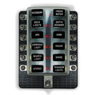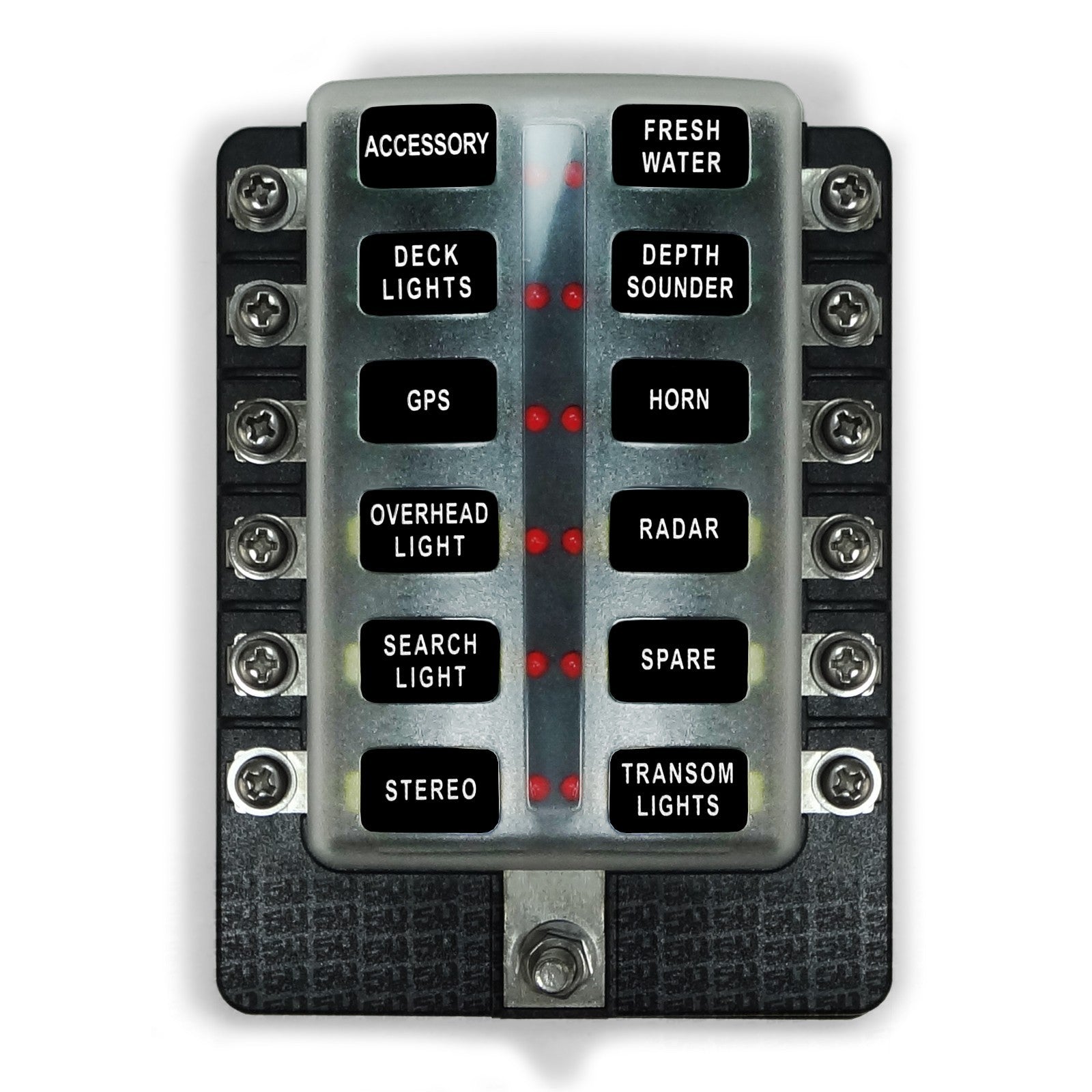 Universal 12 Way Screw fuse box and distribution board with terminals for both the negative and positive sides of the circuits. This fuse box is suitable for all kinds of automotive and marine applications, including 6V, 12V & 24V systems (maximum voltage 32V). Each fuse holder is designated a custom label for identification and to make fuse installation as easy as possible. The fuse box is also quipped with red LEDs that illuminate when a fuse is blown making it easy to identify blown fuses and makes for easier problem solving.
