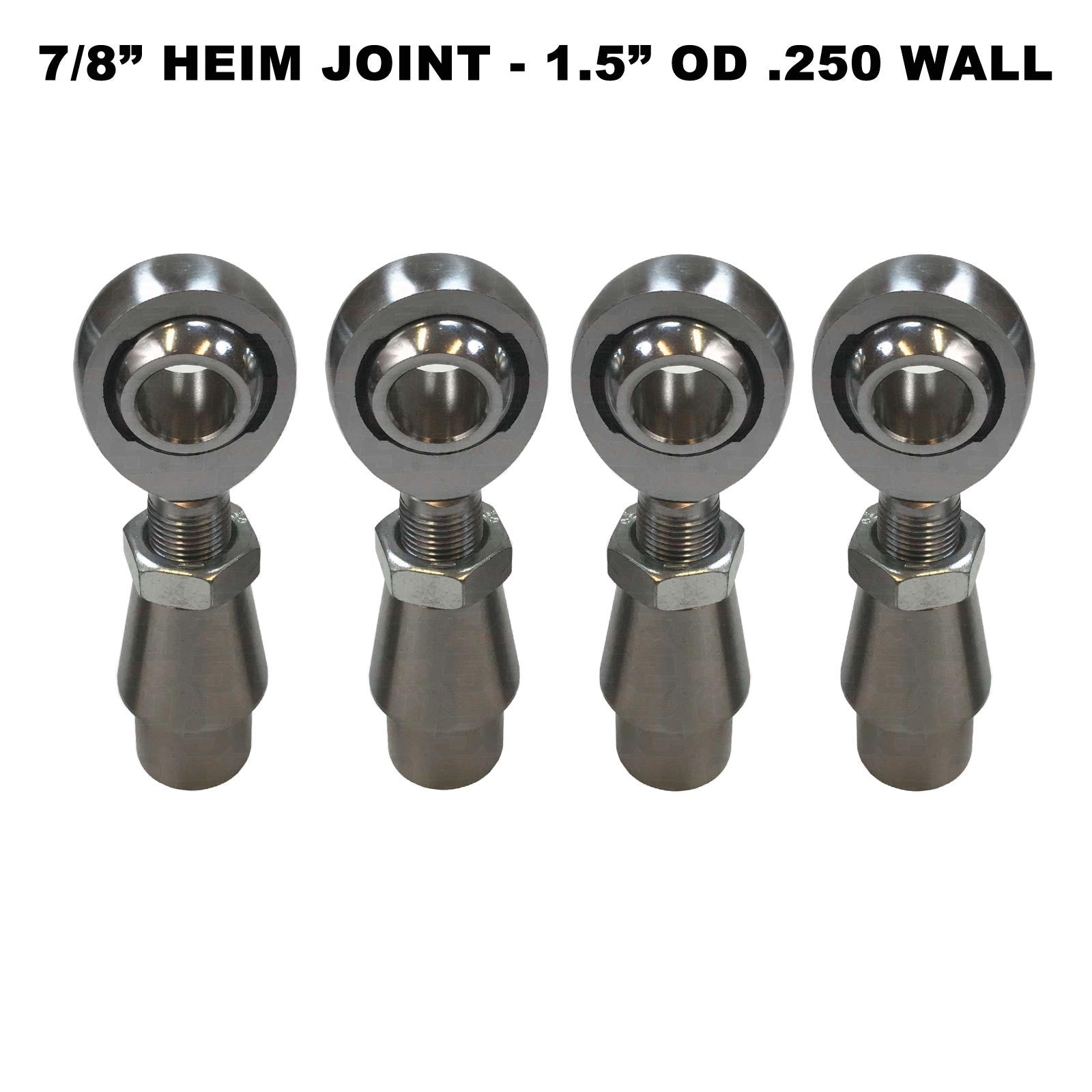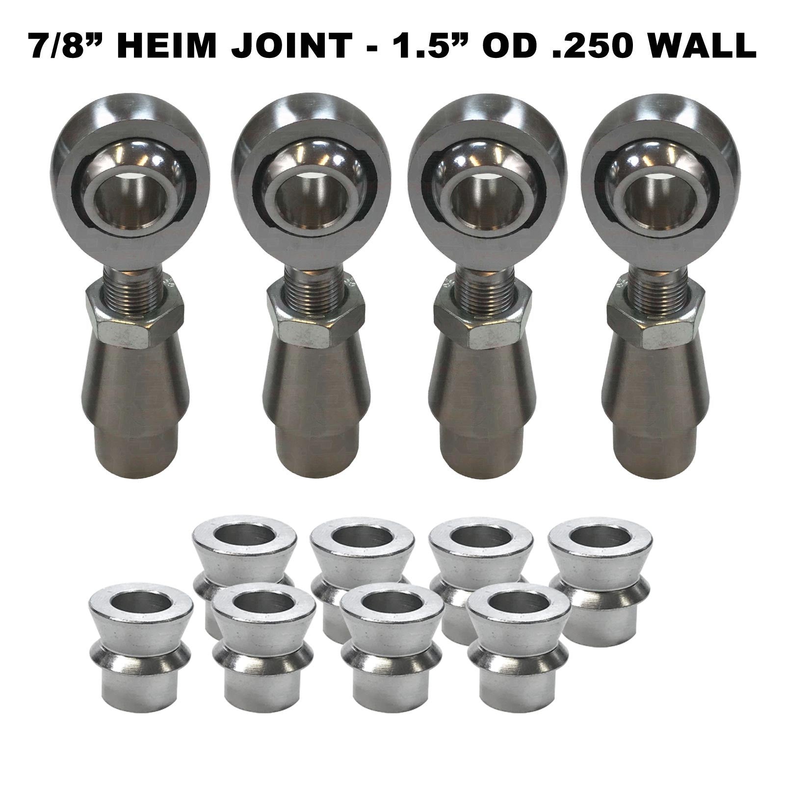 Rod end fabrication kit complete with 7/8" thread x 7/8" bore chromoly heim joints, jam nuts, and chromoly weld in bungs (tube adapter). Designed to fit 1.5" OD tubing, with wall thickness of .120 or .250. Heim joints are made from 4130 Chromoly steel, with a nylon / teflon PTFE liner. The load rating and size make these excellent for building custom sway bar links, tie rods and radius arms for cars, trucks, sand rails and more. Includes two Left hand thread and two Right hand thread heim joints, jam nuts, and matching bungs. Available with or without high misalignment spacers.